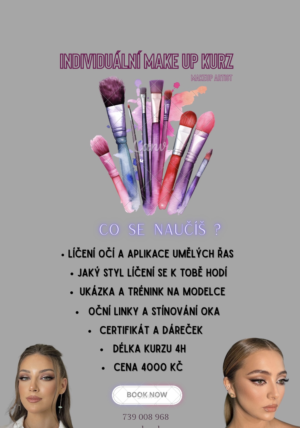 V mém salónu Vám vykouzlím make-up na každou příležitost. Zkrášlím vaši pleť, obočí či řasy a najdete zde také mnoho služeb v péči o tělo.