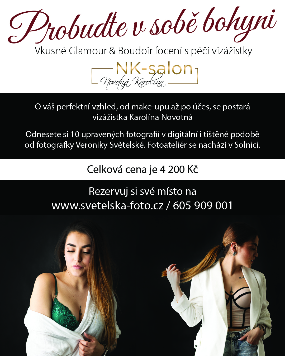 Chceš mít konečně fotky, na kterých se sama sobě budeš líbit?… ✨Postarám se o tvůj dokonalý make-up i úpravu vlasů, aby vynikla tvoje přirozená krása. 💖💄A společně s úžasnou fotografkou jsme vytvořily jedinečný glamour & boudoir zážitek, který ti dodá sebevědomí. 📸✨ Celé focení probíhá v příjemné, uvolněné atmosféře, kde se budeš cítit dobře a přirozeně.